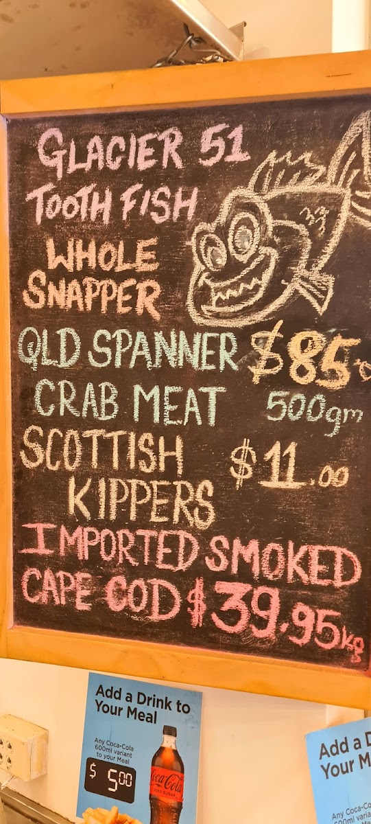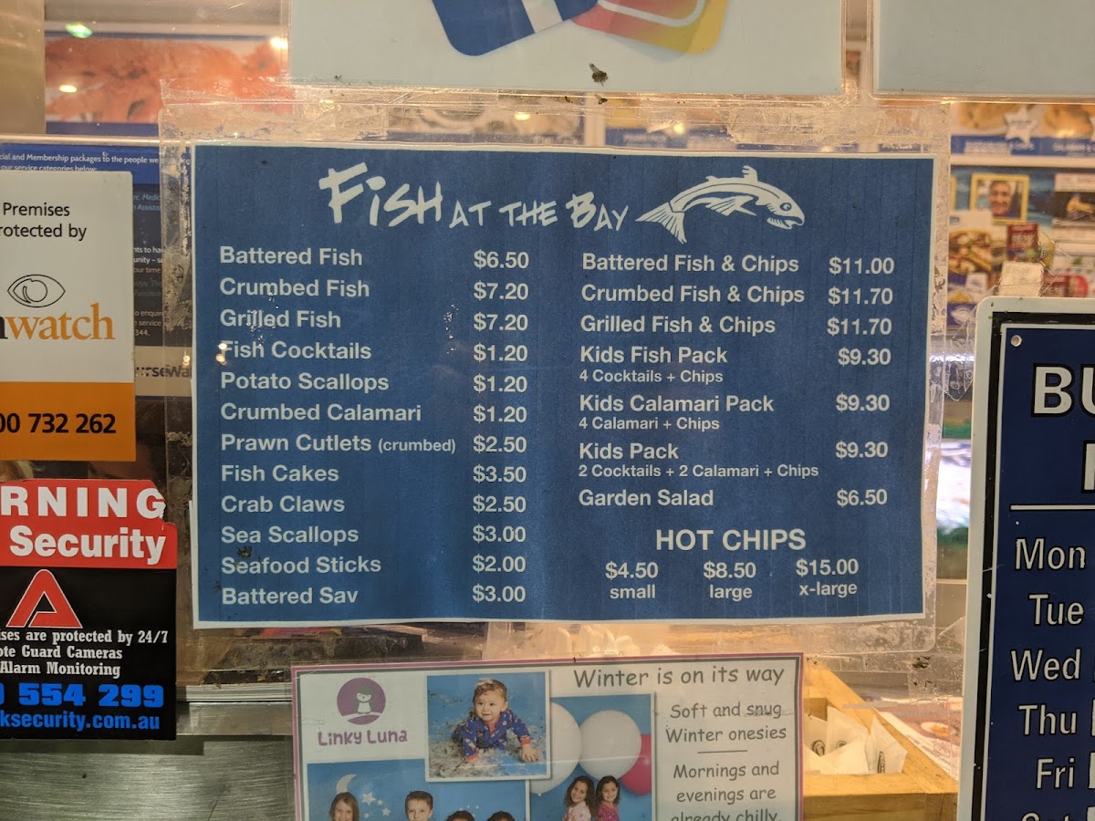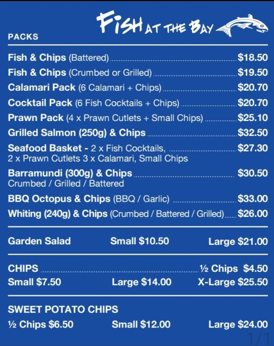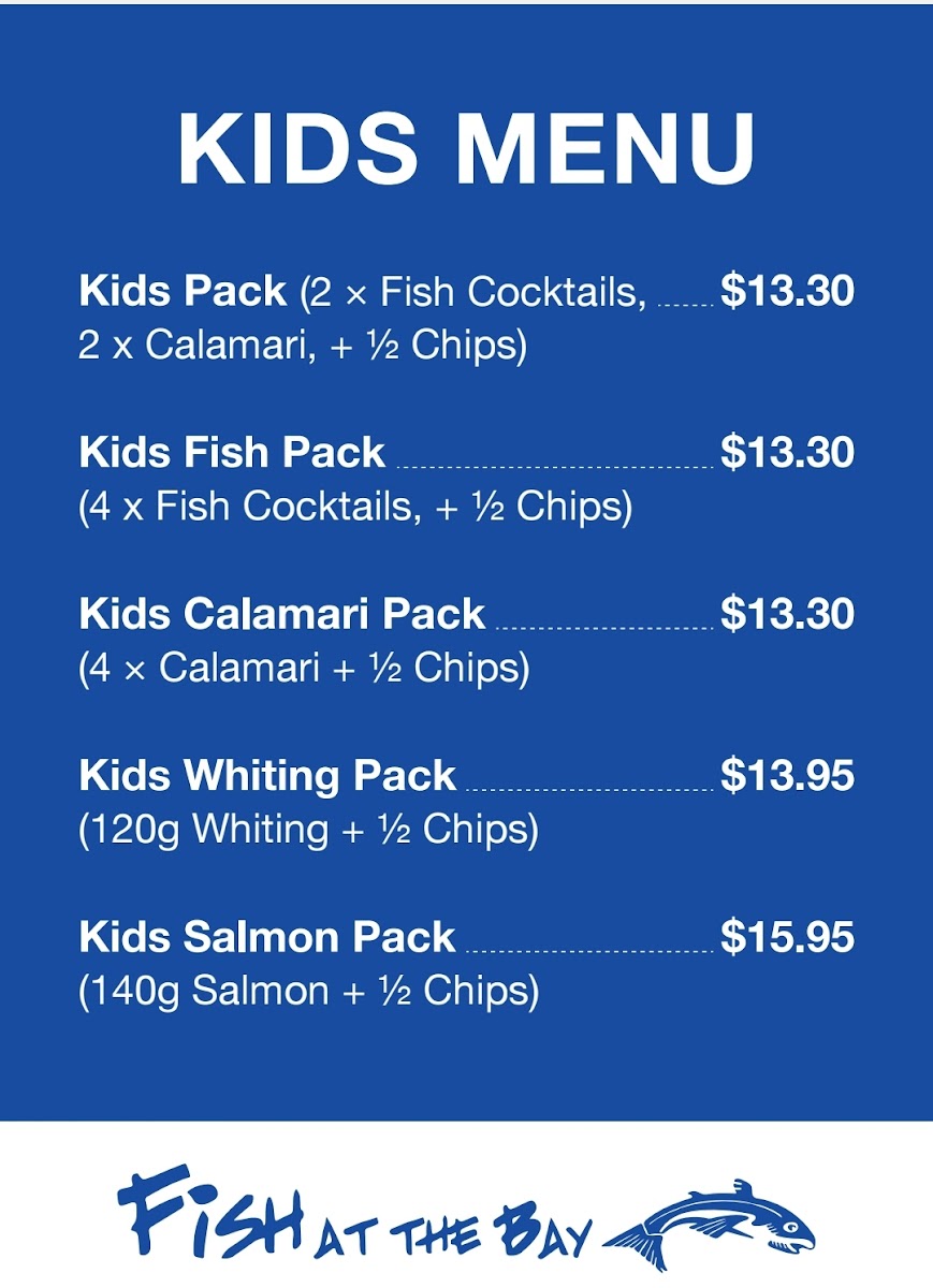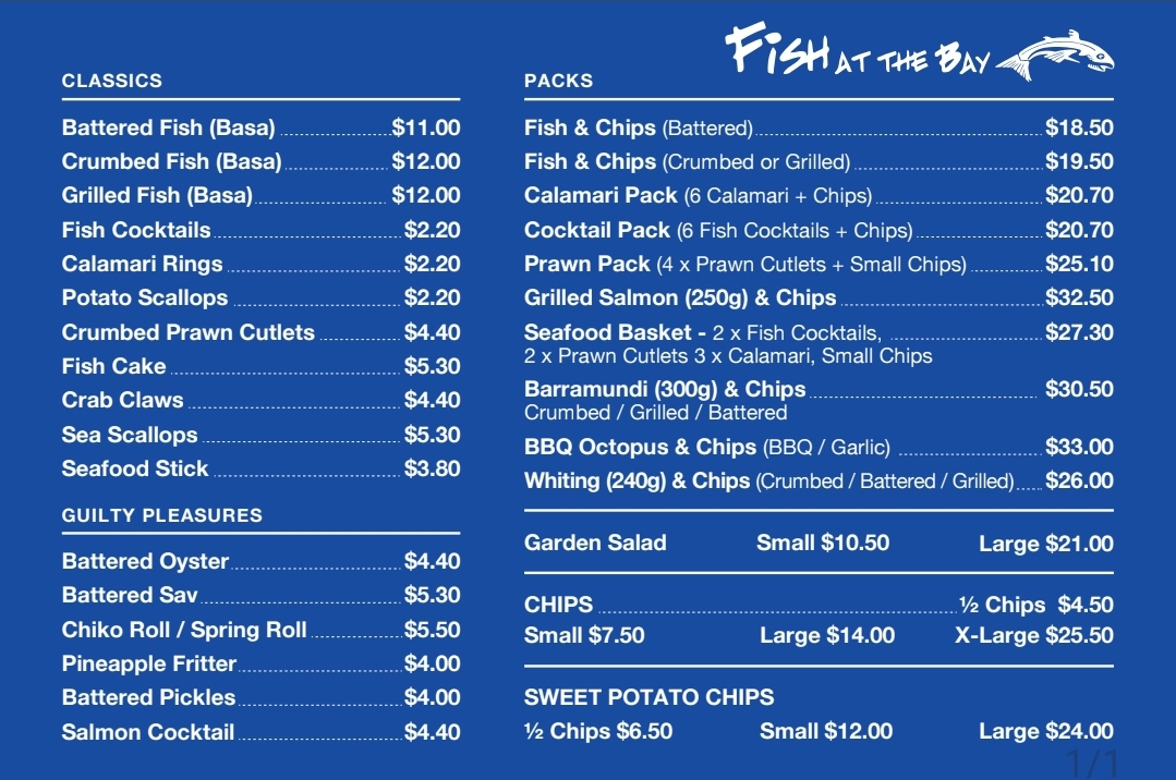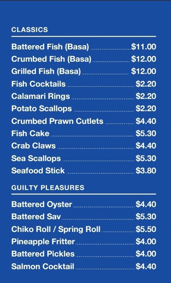 From a reviewer’s perspective, the menu at Fish At The Bay offers a comprehensive selection that balances classic favorites with indulgent treats. The Packs section features hearty options like Fish & Chips, Calamari Pack, Cocktail Pack, Prawn Pack, and Grilled Salmon (250g) & Chips, perfect for sharing or a filling meal. In the Classics category, diners can enjoy traditional seafood staples such as Battered Fish, Crumbed Fish, Grilled Fish, Fish Cocktails, and Calamari Rings, highlighting the restaurant’s focus on fresh, well-prepared fish. For those seeking something a little more decadent, the Guilty Pleasures menu presents treats like Battered Oyster, Battered Sav, Chiko Roll, Pineapple Fritter, and Battered Pickles, offering a fun twist on familiar flavors. Families are well catered for with the Kids Menu, which includes Kids Pack, Kids Fish Pack, Kids Calamari Pack, Kids Whiting Pack, and Kids Salmon Pack, ensuring younger diners have satisfying portions. Finally, the Fish At The Bay section revisits favorites with options like Battered Fish, Crumbed Fish, Grilled Fish, Fish Cocktails, and Potato Scallops, rounding out a menu that is both approachable and varied. Overall, the menu demonstrates a clear dedication to seafood, with choices that appeal to traditionalists, adventurous eaters, and families alike.